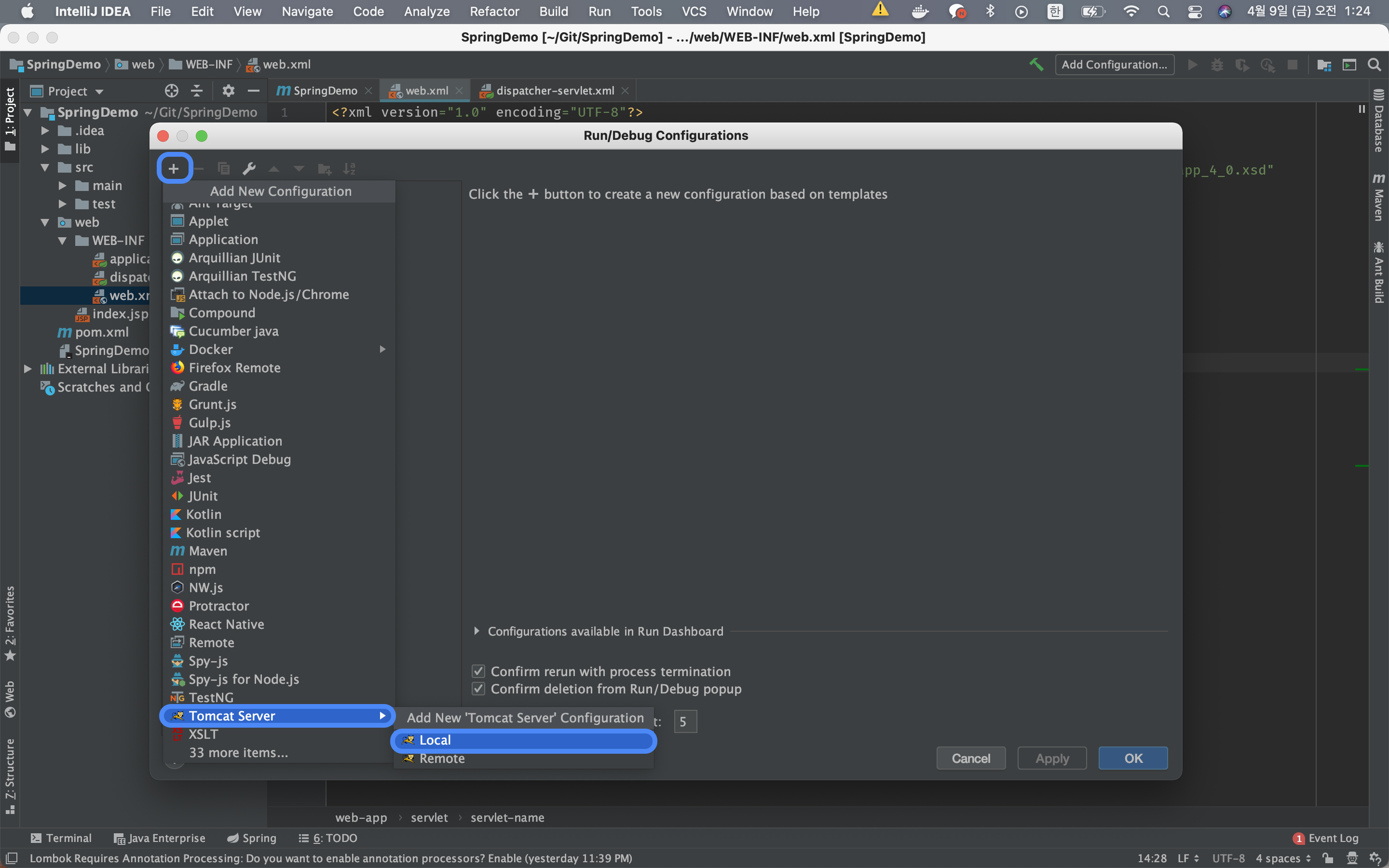 좌측 상단에 + 를 눌러 Tomcat Server > Local 를 선택해주세요.