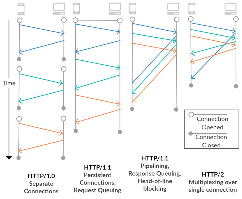 HTTP/2는 Multiplexed Streams를 이용하여 Connection 한 개로 동시에 여러 개의 메시지를 주고 받을 수 있으며 응답은 순서에 상관없이 Stream으로 주고 받습니다. RTT 시간이 줄어들어 별도의 최적화 과정이나 도메인 샤딩없이 웹 사이트 로드 속도가 빨라집니다. HTTP/1.1의 Connection Keep-Alive, Pipelining의 개선된 것을 알 수 있습니다.