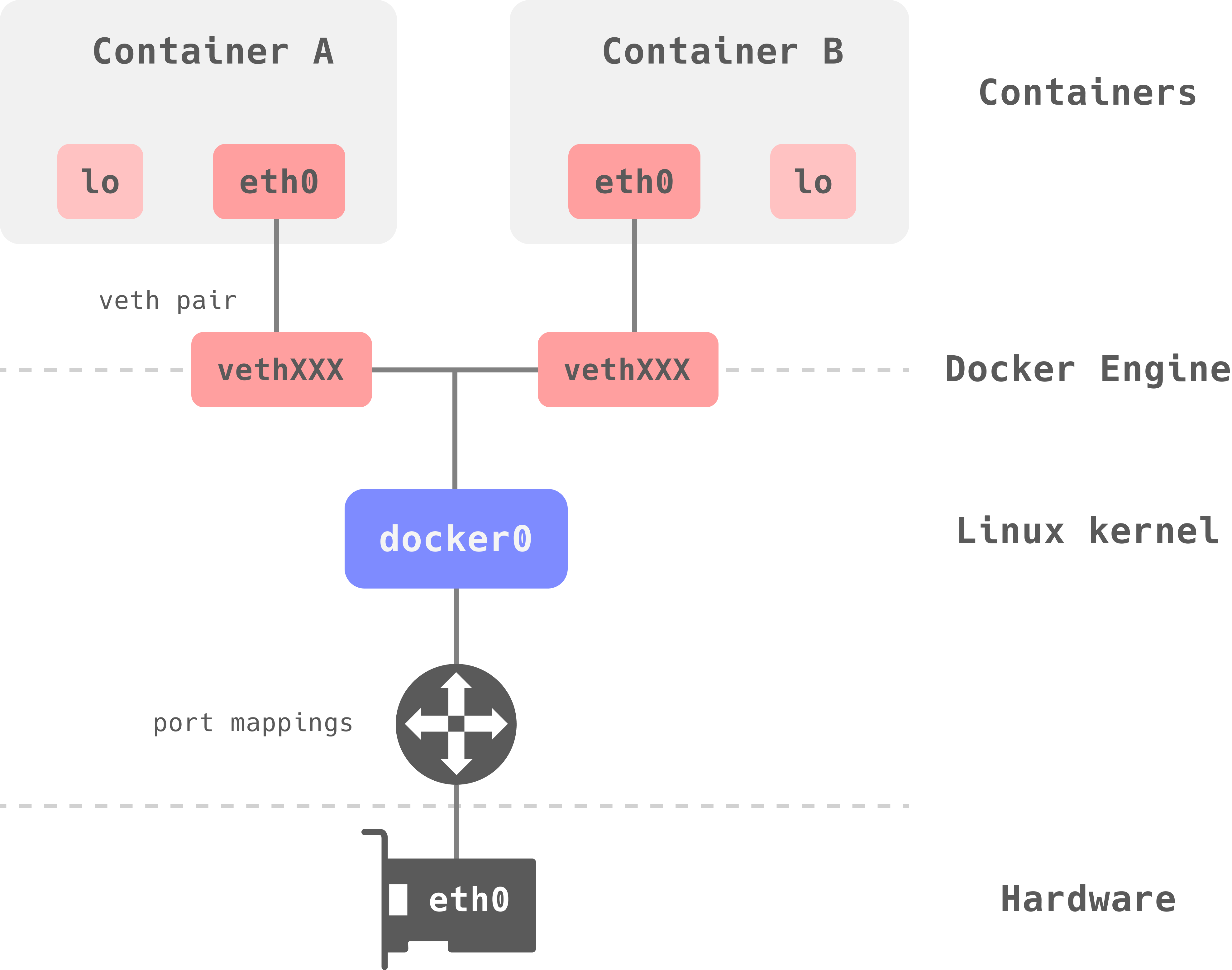 ๊ทธ๋์ ๋์ปค ์์ง์์๋ ํธ์คํธ์ veth ๋ผ๋ ๊ฐ์ ๋คํธ์ํฌ ์ธํฐํ์ด์ค๋ฅผ ๋ง๋ค๊ณ , ๊ฐ ์ปจํ ์ด๋์ eth0์ ์ฐ๊ฒฐํฉ๋๋ค.